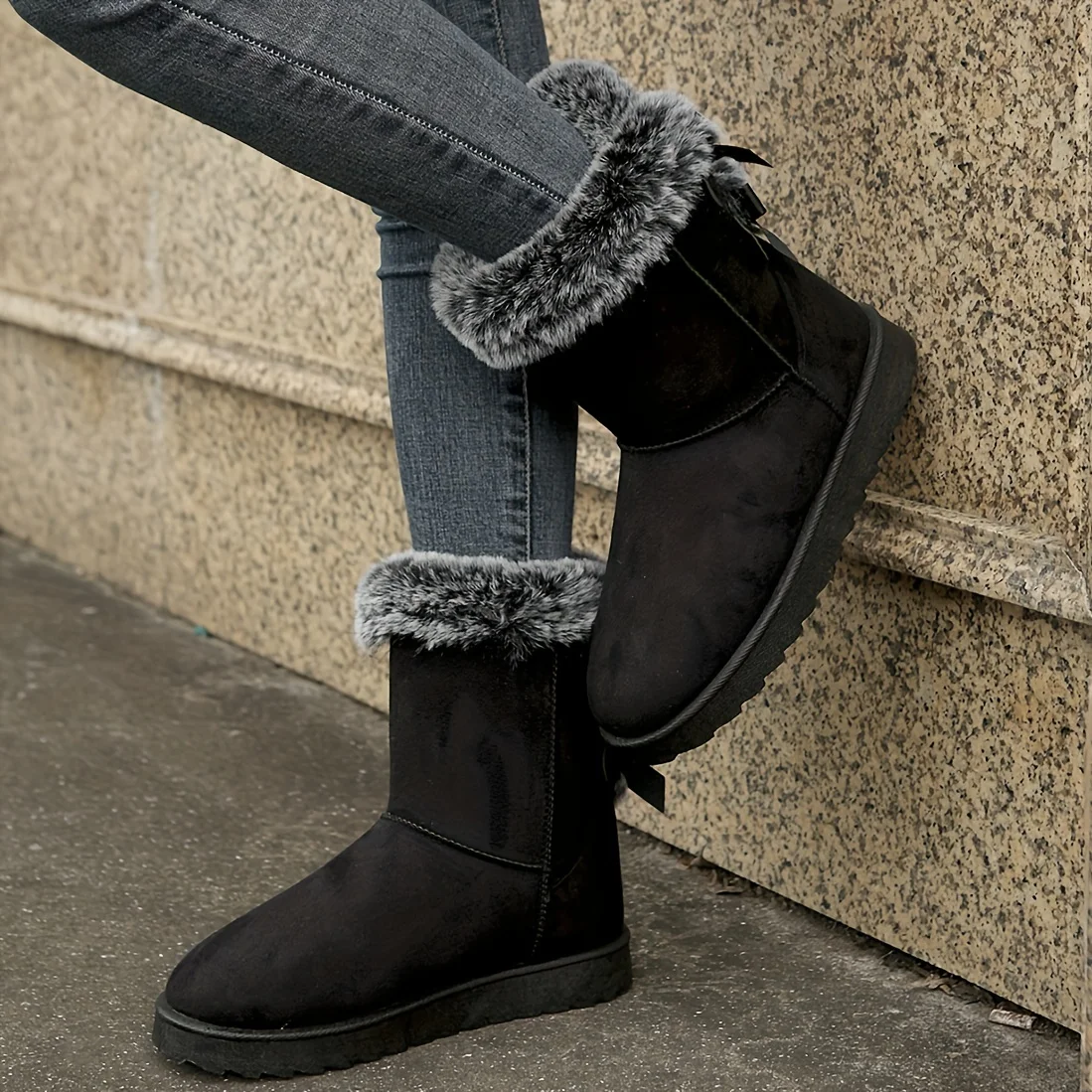 Pantoufle Bottes Fluffy Solides, Décor Bowknot Doublée Thermique