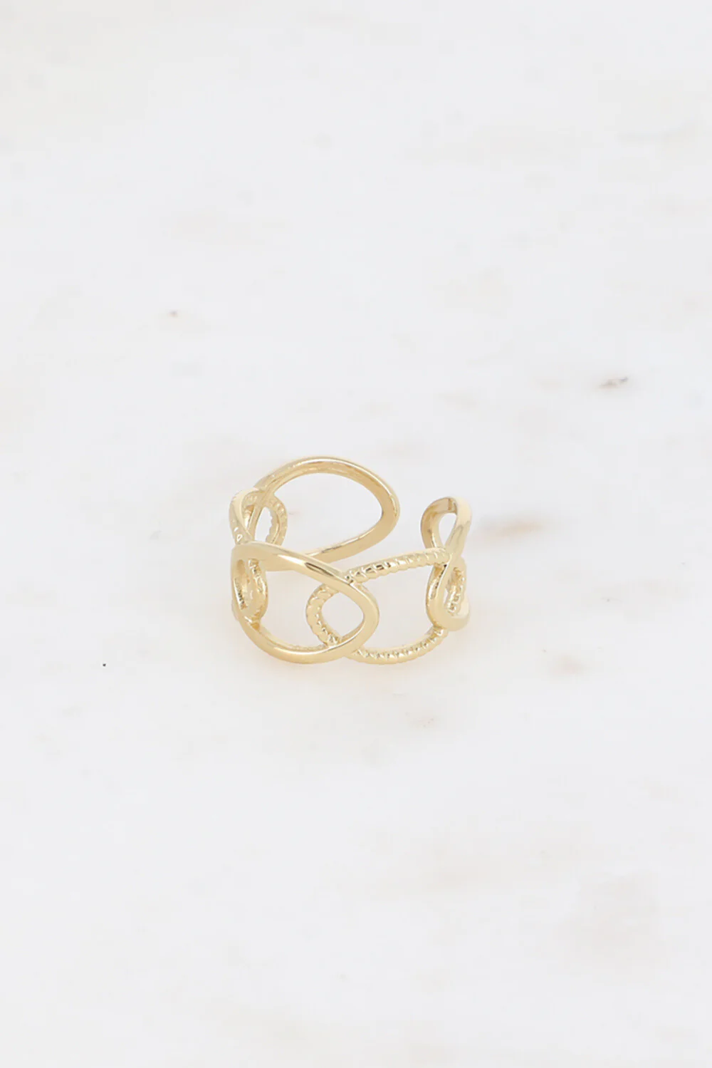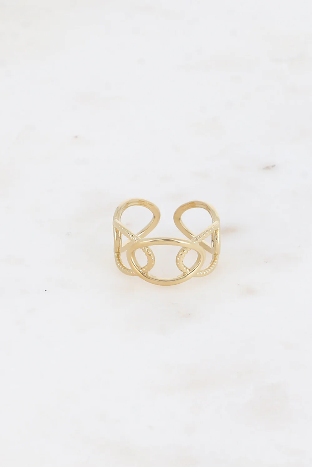 Bague en acier inoxydable composĆ©e d’un motif maille ajourĆ©e alternĆ©e, lisse et tressĆ©e.Ajustable, la bague se resserre ou s’agrandit : de la taille 52 Ć 56Hauteur de la bague: 10mm Garantie sans nickel, sans cadmium, sans sel de plomb.RĆ©siste Ć lāeau et ne noircit pas.