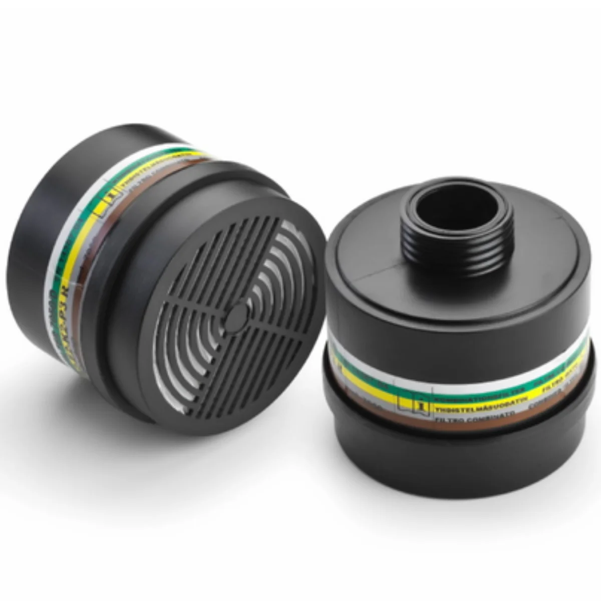 - Protection A2B2E2K2P3 contre les gaz, vapeurs organiques (point d’ébullition > 65°C), poussières, brouillards et fumées toxiques fines