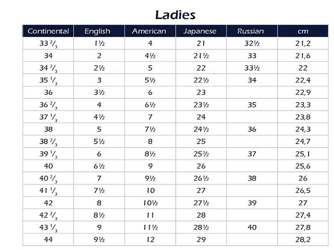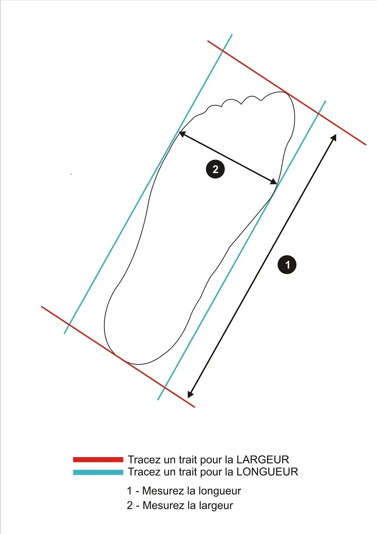 | POINTURE | 33 2/3 (1/5), 34 (2), 34 2/3 (2/5), 35 1/3 (3), 36, 36 2/3 (4), 37 1/3 (4/5), 38, 38 2/3 (5/5), 39 1/3 (6), 40 (6/5), 40 2/3 (7), 41 1/3 (7/5), 42 (8), 42 2/3 (8/5), 43 1/3 (9), 44 (9/5) |