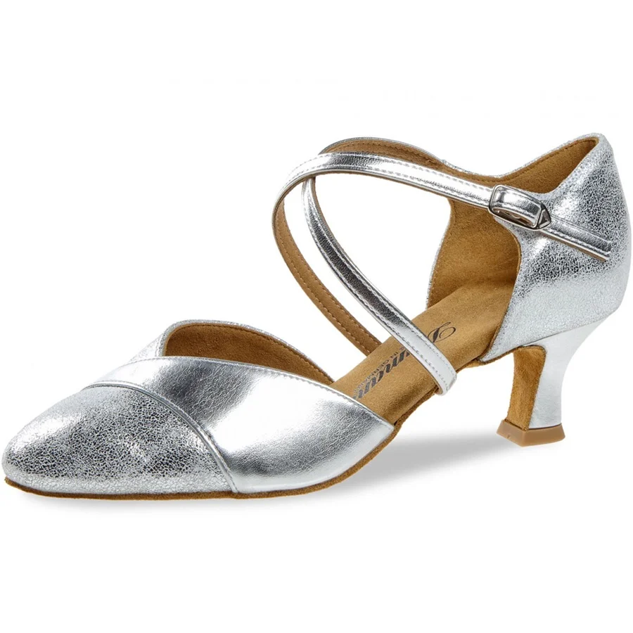Chaussures de Danse Standard fermées argent Diamant fabriquées en Allemagne à la main. Bouton pression pour fermer/ouvrir rapîdement, Lanière réglable. Modèle adapté pour les pieds normaux (pas larges): E1/2 (normale) Talon Latino (évasé): 5 cm
