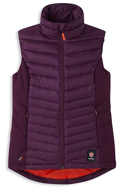 Doudoune légère sans manche déperlante en duvet polyester 140g utilisé pour le corps et 120g pour le col.