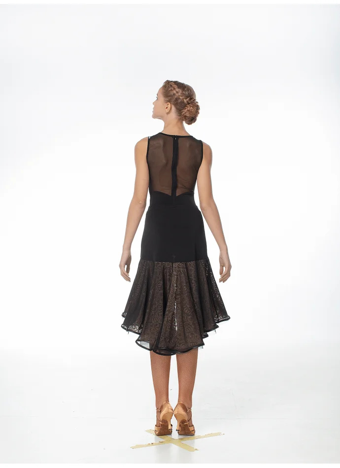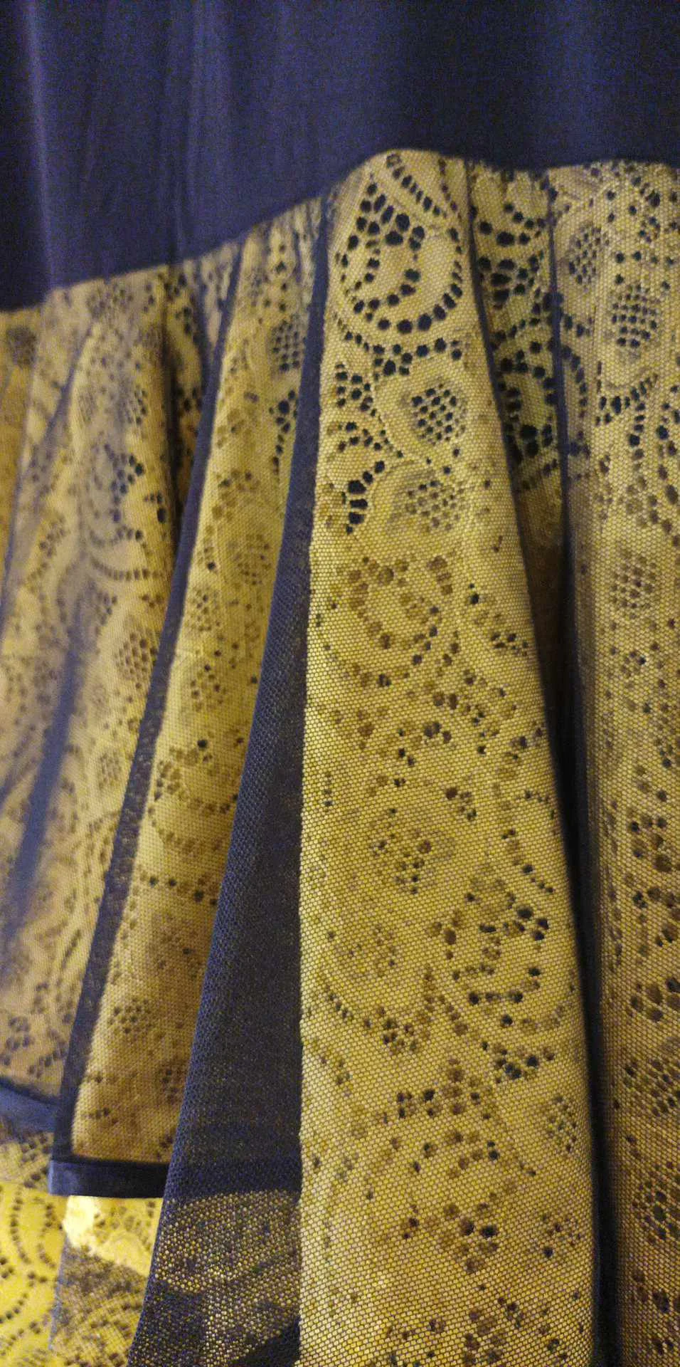 Jupe de danse latine femme DANCE ME adaptée aux danses latines et salon. Ce modèle est doublé de dentelle guipure noir et jaune soleil, dentelles élégantes apportant une légèreté et fluidité dans les mouvements. (voir photos détails jupe)